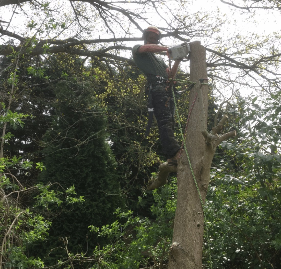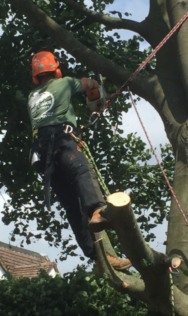 Straight felling starts by cutting a notch at the bottom of the tree trunk, which determines the direction of its fall. This is then followed with a felling cut, which causes the tree to fall. We are then able to direct the tree safely to the ground in one go, hinging the tree from the cuts. For section felling, a highly trained arborist is safely harnessed to the tree, and cuts down individual sections, which are then lowered to the ground using specialist rigging.